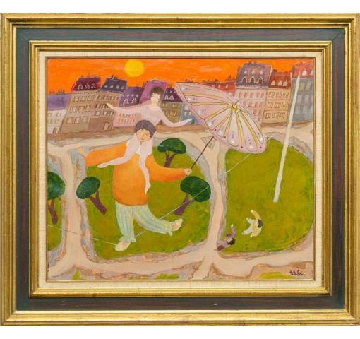 Olie op doek "Risques à deux", achteraan gesigneerd A. Teleki, 1973, Hongaars kunstschilder, vooral actief in Zwitserland en Australië, 75x86cm