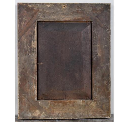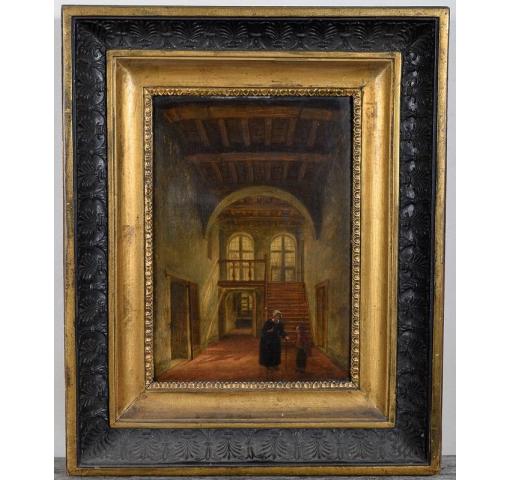 Olie op eikenhouten paneel, interieurtafereel van een vestibule met oude dame die een kind berispt, 18e eeuw, 41x34cm